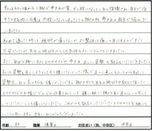 優しい施術で、丁寧に体を緩めて頂き、施術して頂いた日は首周りの血行が良くなり、視力が良くなったと感じるほど効果が実感できました。