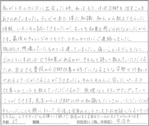 姿勢も良くなり歩く度に痛みがはしっていたのがうそのようになくなりました。