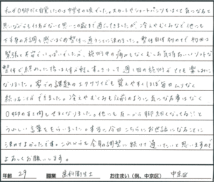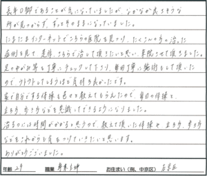 頭痛 首痛(10代女性 小学生 京都市西京区)193 最終更新日時 : 細江トオル私は首を強く打った後治ったけど頭痛がひどくこの「トオルカイロ」に行きました。「とても痛いんだなあ」と思っていたけれどとてもやさしくおもわずねてしまいました。(笑)マッサージの後いつもおきる頭痛がなくなっていた!私は、身体に不満のある人はぜ行ってみてほしいです!12才 小学生FacebookXBlueskyHatenaCopy
