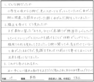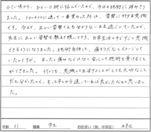 後に響くことがなく、安心でした。施術もいたみはなく、とてもからだが軽くなり、楽になりました。