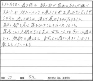 O脚矯正(20代女性 学生 京都市左京区)338 最終更新日時 : 細江トオルトオルカイロさんに通う前は、自分の脚が好きななれず、自分では脚の状態が良くわからずでしたが先生と出会って0脚であることが判明し驚きました。どこに歪みが生じていて、その改善方法もきちんと教えてくださって、日々の生活の姿勢から直すことが出来るようにまでなりました。私自身0脚ということを自覚していませんでしたが、先生が丁寧に説明してくださり今まで悩んでいた気持ちが楽になったのが一番嬉しかったです。通うことで歩きやすくなったり一日の終わりにくる疲労感が軽減されていて正しい姿勢が日常にこんなに関係していたことに驚いています。22才 学生O脚を本気で改善させたい方はこちら↓ FacebookXBlueskyHatenaCopy