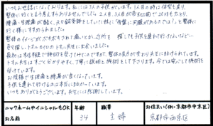 頭痛 肩こり 子連れ (30代女性 管理栄養士 京都市伏見区)211 最終更新日時 : 細江トオル産後、眠れないくらいの頭痛でつらい思いをしていましたがトオルカイロへ通うことで少しずつ改善していきました。今までは「バキバキ!」と音がしたりアザができたこともあった整体に通っていたこともあったので、初めて施術を受けたときは少し物足りないような気もしましたが、翌日がとても楽に過ごせるので効果を実感しました。日々の生活で気をつけること、エクササイズ、良い姿勢について教えてもらえたこと何よりも0歳の子供と近くにいながら受けられるのが、本当にありがたいです。これからも家族のためにも元気で過ごせるようにしていきたいと思います。39歳 管理栄養士子供をあずけるあてがない、子供も一緒に連れていきたい方は、お子様も一緒にご来院↓ FacebookXBlueskyHatenaCopy
