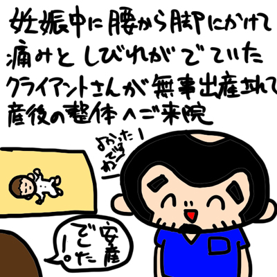 妊娠中に元々あった腰痛がひどくなり、脚まで痛みやしびれがでてたクライアントさん。