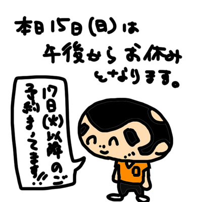 明日16日(月)はお休みですので、17日(火)以降でのご予約お待ちしております!