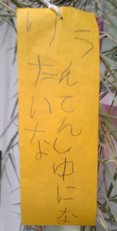 七夕 2011年7月7日 最終更新日時 : 2011年7月7日 toru-chiro 今年も玄関にかざってありました パティシエになりたいいうてたんちゃうかったっけ 今回は「セミナーから早く帰ってきて」はなかったです FacebookXBlueskyHatenaCopy