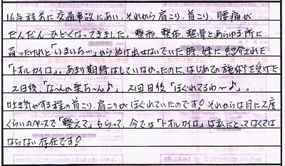 「16年前に交通事故にあい、それから肩こり、首こり、腰痛がだんだんひどくなってきました。