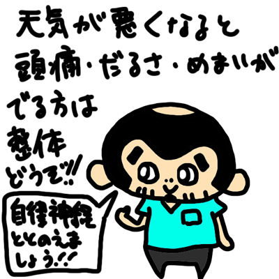 さて、お天気が悪くなる(曇りや雨)で頭痛やめまい、体がだるいなどの症状がすごく出やすい方は整体受けてみてください。