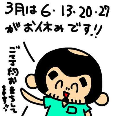 さて3月は、6日(月)・13日(月)・20日(月)・27日(月)がお休みとなっております。