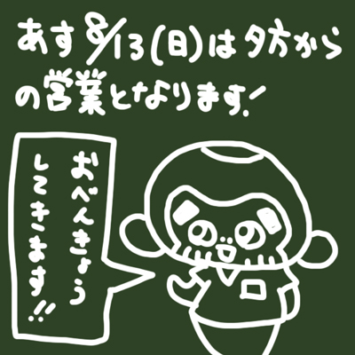8/14(月)・8/15(火)は2連休となりますので明日どうぞ。