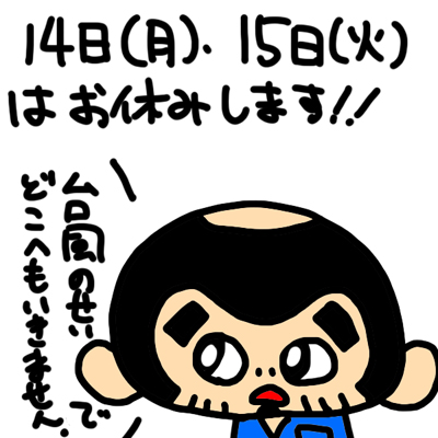明日8/14(月)・8/15(火)は連休です。