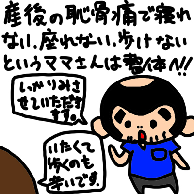 産後で恥骨痛でいらっしゃる場合は育児家事に支障をきたしてるので、かなり産後早くにご来院されるケースが多く、早いと産後10日~3週間の間くらいです。