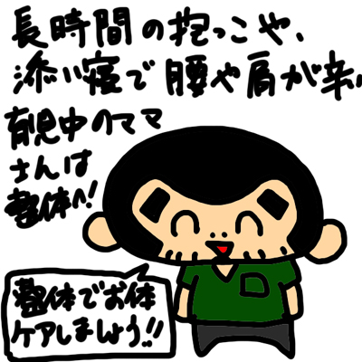 産後の育児で赤ちゃんを長時間抱っこしたり、添い寝したりで肩こり・首こり・背中のはり・腰痛・腕の痛みなどなどの症状が出て朝起きたら体が固まってしんどいママさんは整体でお身体をケアしましょう!