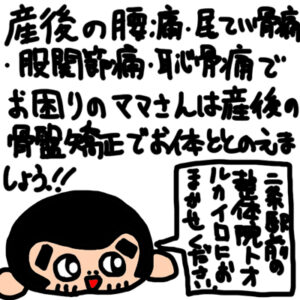 産後の骨盤から腰痛や肩こり膝痛や背中痛などなどでお困りのママさんは是非ご来院ください。