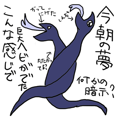 夢で蛇 2011年8月6日 最終更新日時 : 2011年8月6日 toru-chiro 今朝みた夢。 庭で巨大なヘビ2匹がいて、からみあってました 一匹へ床下に消えました もう一匹は死んじゃいました どういう意味なんでしょう?? FacebookXBlueskyHatenaCopy