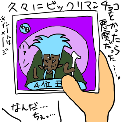 ビックリマンチョコ 2012年4月25日 最終更新日時 : 2012年4月25日 toru-chiro 今日、コンビニでビックリマンチョコが売ってたので購入したんですが・・・。 悪魔でした。 あぁ残念。 冷蔵庫に張っておこう。 FacebookXBlueskyHatenaCopy
