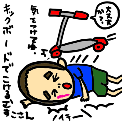 そんなわけで、さっそくキックボードにのったようですが、早速こけて顔すりむいたようです。