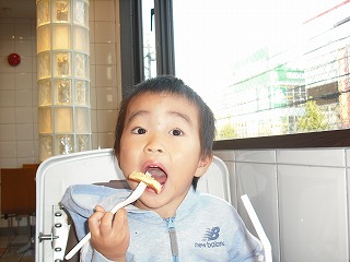 プチパンケーキを一気に食べて遊んでました
