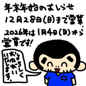 あっという間に2025年もあと1カ月ですね。 年末年始の営業についてですが、 12/28(日)まで営業します。 12/29(月)~1/3(土)までお休みします。 2026年は1/4(日)より営業します。 体が不調な方は年 […]