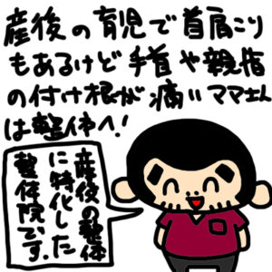 産後の不調で、肩こりや腰痛もあるけど、手首や親指の付け根が痛くて育児や家事に支障をきたしてる産後ママさんは二条駅前の整体トオルカイロプラクティックへお越しください。 当院は産後の整体(産後骨盤矯正)に特化してる整体院です […]