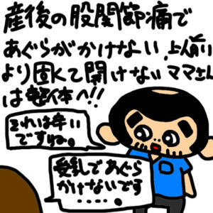 産後に股関節の痛みがでるママさんで、あぐらの姿勢や脚を広げると痛みを感じます。 元々、股関節が固かったり、妊娠中に股関節が痛くなって産後も痛い場合もあったり、出産時に股関節を痛められることも。 どっちにしても股関節自体の […]