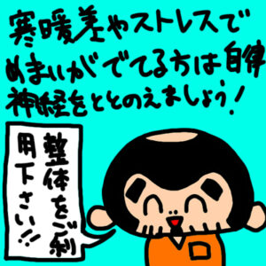 寒暖差やストレスでめまいがでてる方が急増中です。 朝晩は寒いですし、温度調整が大変難しいですね。 また新しい環境や生活習慣が変わってストレスがかかってる方や疲労もたまってると自律神経が乱れてしまいます。 そしてめまいや頭 […]