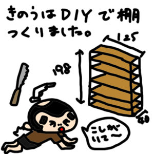 昨日は家で長年使ってたタンスをやめて棚にしようということでDIYで棚作りました。 ホームセンターで角材と1×6の板を買って午後から夕方まで嫁さんも作り上げました。 腰はやばかったです。 普段しない姿勢なので、最後のほうは […]